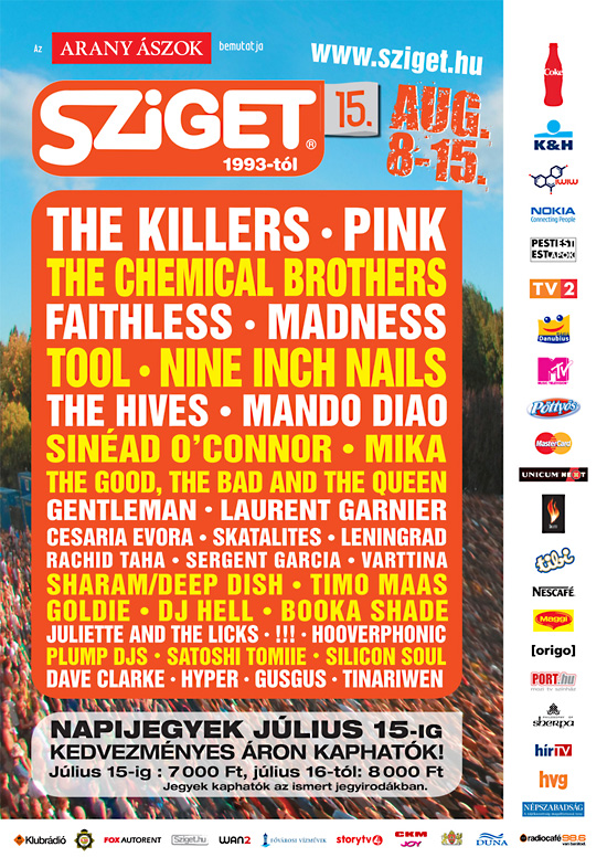 Bei der 15. Ausgabe des Sziget Festivals kamen die Künstler aus 56 verschiedenen Ländern der Erde. Mit 500 Bands und anderen Performern war auch Ungarn als Heimatland des Sziget auf dem Festival stark vertreten. Der einzige Wermutstropfen: starker Regen hielt einen Teil des Publikums aus Ungarn selbst, der sonst zum Festival kommt, davon ab, diesem einen Besuch abzustatten. Dennoch lag die Gesamtzahl der Besucher bei über 350.000. Während des Festivals wurden auch Musikerfreundschaften geschlossen – beispielsweise als Manu Chao sich eine Gitarre des Frontmanns der ungarischen Band Quimby lieh, was eine gemeinsame Jamsession im Backstage-Bereich zur Folge hatte, die bis zum Morgengrauen andauerte. Auch eine andere Künstlerin hatte eine entspannte Zeit auf dem Sziget: Pink bestellte sich während ihres Auftrittes kurzerhand direkt von der Bühne aus einen Cocktail und dankte dem Kellner, der sie damit versorgte, mit einer großen Verbeugung – vor den Augen von 40.000 begeisterten Fans. Im selben Jahr setzte auch der viermillionste Festivalbesucher seinen Fuß auf den Boden des Sziget Festivals.